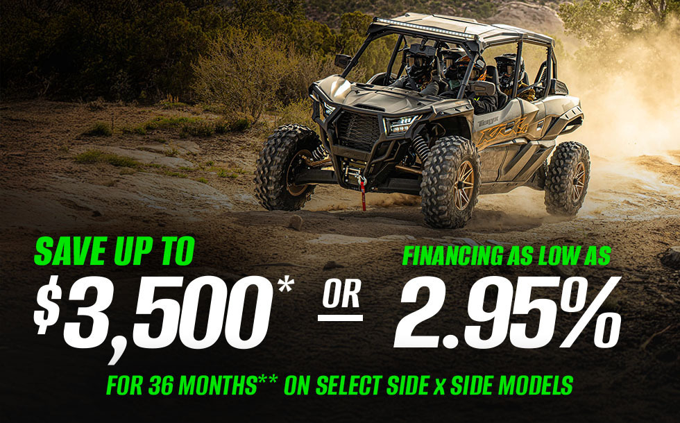 Incentives shown available at participating Kawasaki dealerships, model & year exclusions apply. Subject to change without notice. Offer available on approved purchases of select new, unregistered Kawasaki vehicles. Offer valid for a limited time only.